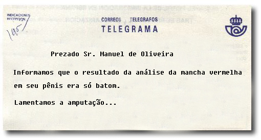 — Pronto, Gislaine — explicou ele pra sua esposa — É só eu colocá no reto, qui fica no finár da coluna cervicár!
